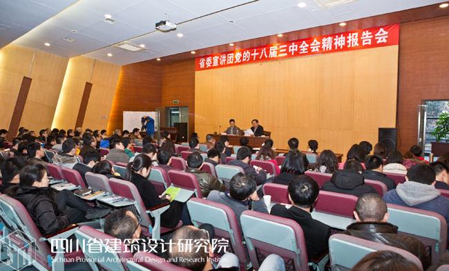 12月16日下午,四川省委党的十八届三中全会精神宣讲团走进省建筑设计研究院在设计楼二楼报告厅宣讲,四川省委宣讲团成员、省国资委党委副书记雷建做专题辅导。我院党委中心组全体成员、全院中层干部、党总支(支部)书记及党员代表130余人参加了报告会。