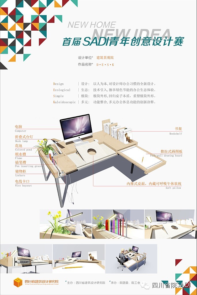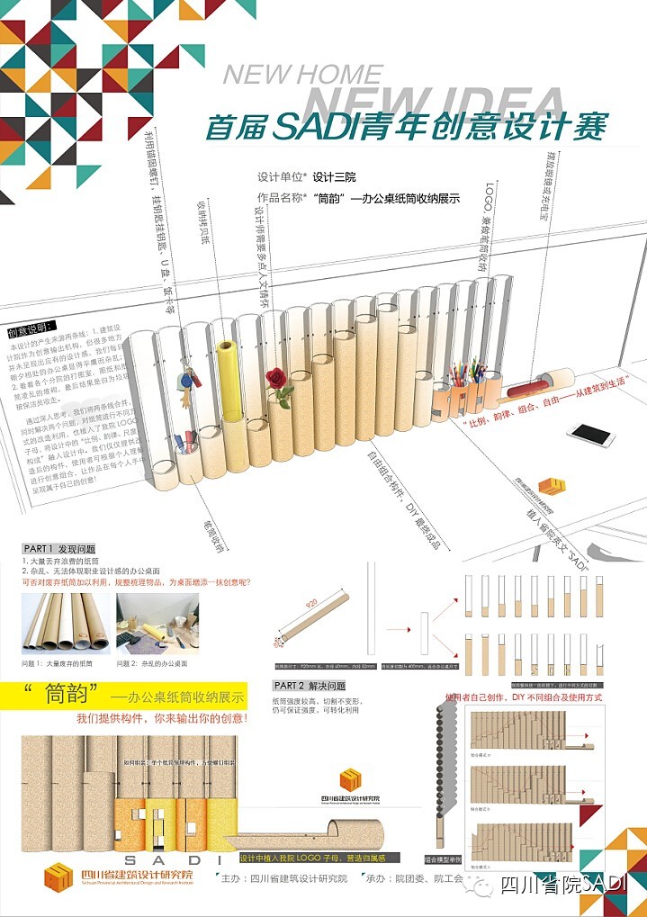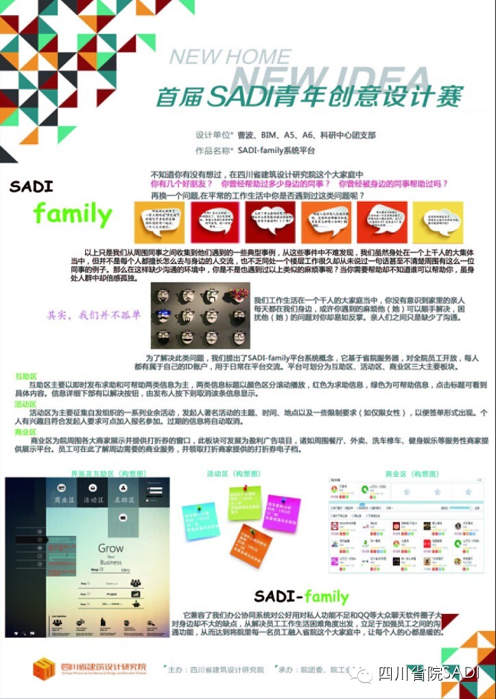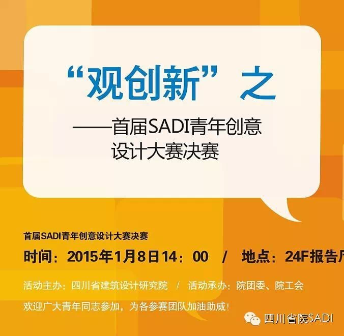 1月8日, 首届SADI青年创意设计赛的决赛在省院的新办公楼内举行。比赛开始之前,主持人介绍了到场的领导及评委。西南交通大学工业设计系黄磊教授、四川大学工业设计系袁萍博士、徐卫副院长兼总建筑师、张理副院长、党委何智群副书记、院常务副总建筑师涂舸先生、曹波工作室主任曹波先生及部分中层领导出席了此次比赛。