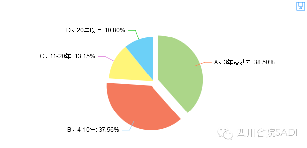 入职三年及以内员工占比达38.50%,4—10年员工占37.56%,两项相加,十年以下入职员工已占省院员工总数76%以上,员工年轻化特点较为明显。