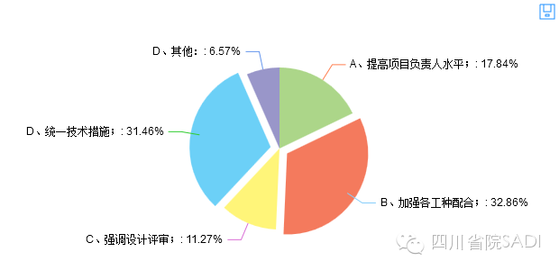 在各个质量控制手段选项中,“加强各工种配合”和“统一技术措施”是最多的两个选项,分别占比32.86%、31.46%。而“提高项目负责人水平”和“强调设计评审”两项比率相对较低。综合起来,加强专业间协作配合、统一技术措施是最重要的质量控制手段,而如何让这两个手段落地实施则仍需进一步调研。